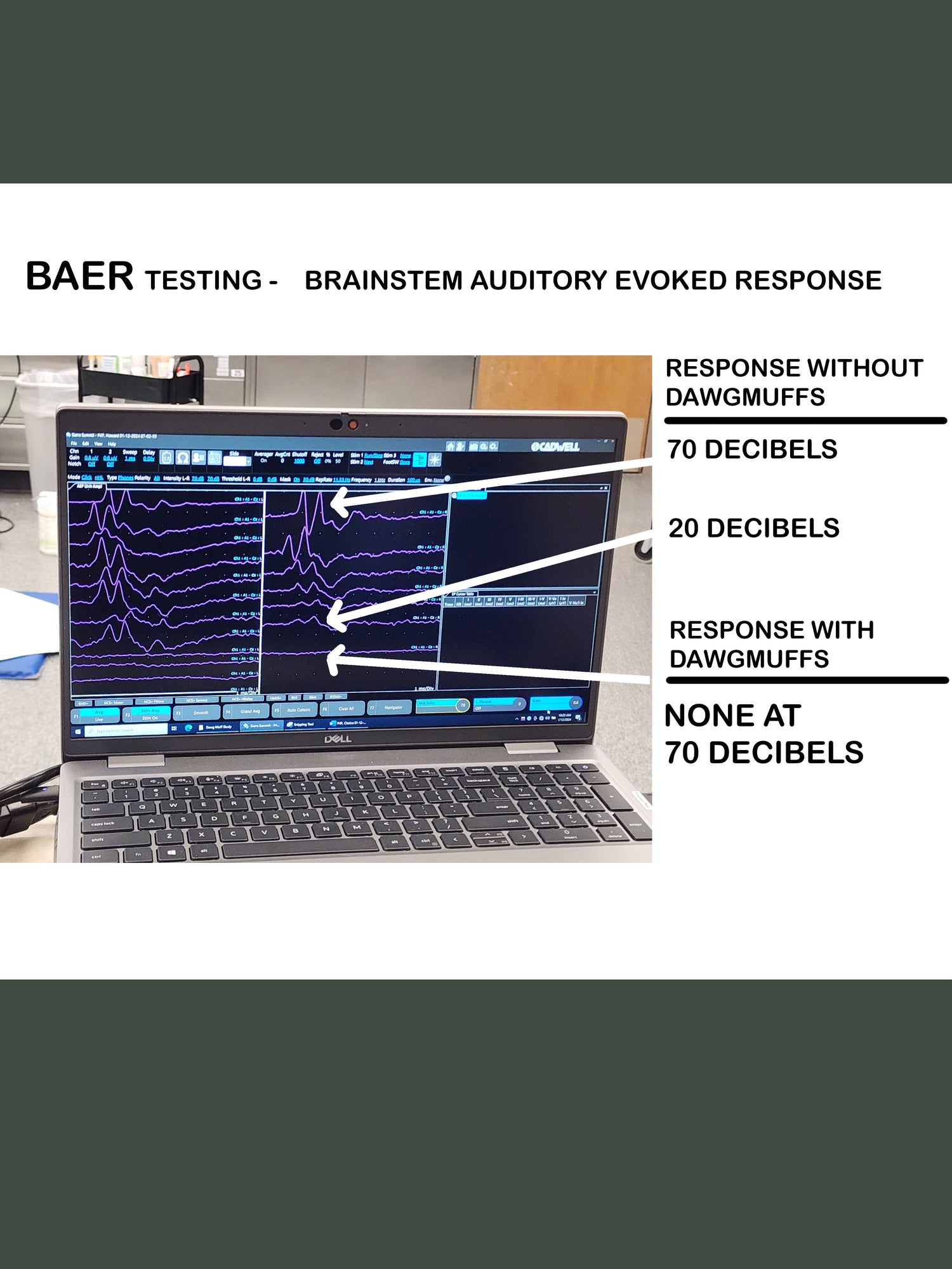The test consisted of recording the brain's response to bleeps of sound emitted through headphones. First, readings were taken without DawgMuffs, beginning at 70 decibels and descending to 20 decibels. Next, DawgMuffs were put on the dogs and the test was repeated, beginning at 70 decibels. While wearing DawgMuffs, every dog's brainstem showed no measurable response to any of the sounds emitted.